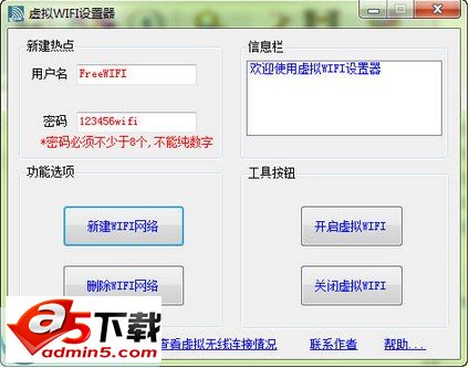 Windows7虚拟WIFI设置器用来在Windows7,Windows8中建立虚拟WIFI,以便其他可以通过WIFI上网的设备通过开启虚拟WIFI的电脑上网。 Windows7虚拟WIFI设置器 v2.3更新内容: 实现一键打开虚拟WIFI。