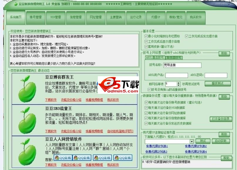 豆豆新浪微博营销王:豆豆软件旗下多位长期从事和研究网络营销、SEO、以及群发软件的工程师历经2年不懈努力开发完成的多功能综合性的博客群发软件。我们开发本软件的目的是要帮助站长、网店主、企业网络推手等需要在网络上进行广告宣传的各界人士解放双手解放头脑,投入最低人力物力成本来达到最佳的网络推广效果。
