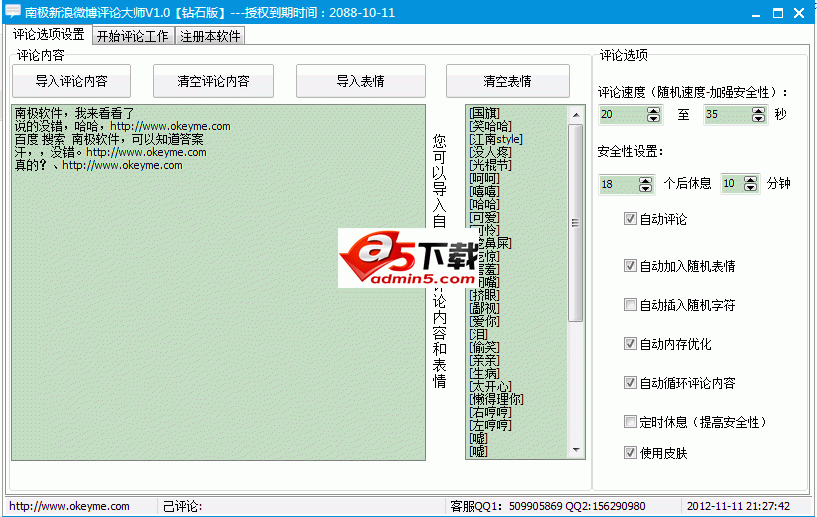 本软件可以自动进行新浪微博的评论,是用来推广网站,网店,淘宝,博客等内容的利器,让你不在为流量发愁!没有微博,你就OUT了,微博如此之类,营销价值没的说!