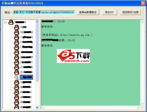功能:手机连接电脑,复制出手机中的QQ聊天数据,在电脑上使用本软件不用密码可以解码查看及导出为TXT文本数据,方便您备份及浏览手机中的QQ聊天数据。