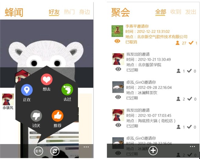 ★聚会不知道如何组织?QQ群短信电话从此都是浮云,用蜂巢发起聚会,免费通知通讯录好友,聚会时间地点都帮你记录通知