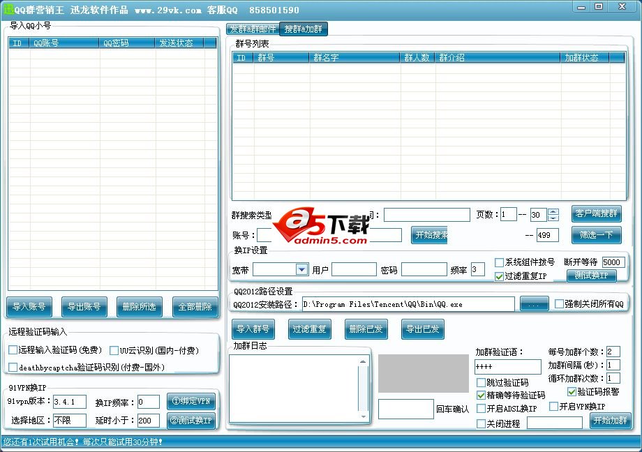 迅龙QQ群营销王是一款专业用于QQ群营销的软件,主要功能为QQ群号码搜索筛选、批量添加QQ群、群发QQ群消息、群发QQ群邮件,是迅龙QQ营销软件 http://www.29vk.com 的最新力作。可按照关键词、最活跃、最相关等条件搜索QQ群号码,按照群内成员人员筛选QQ群号码,支持多条加群验证语。