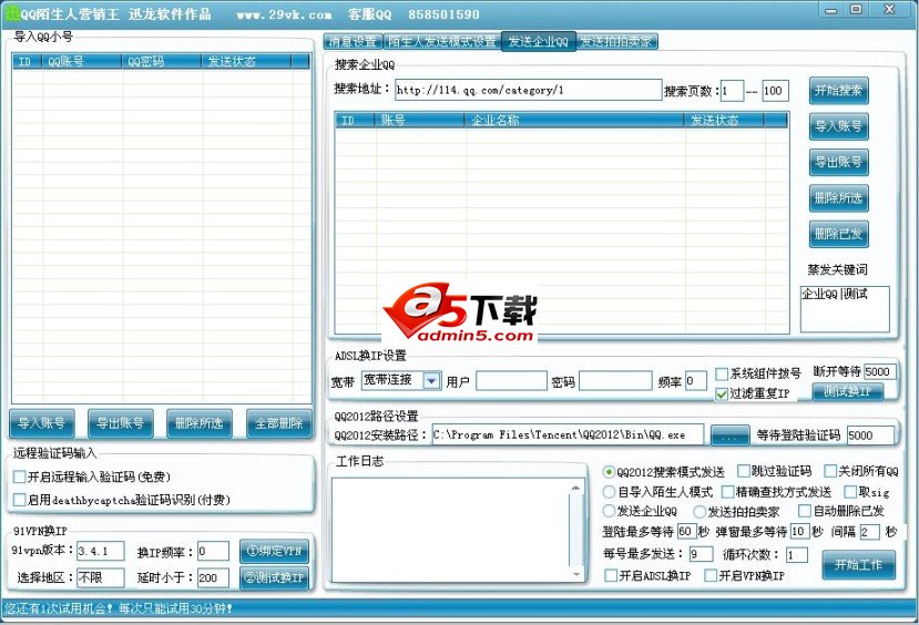 迅龙QQ陌生人营销王发送普通QQ消息,可以按照指定条件(省份、城市、年龄、性别等条件)边查找边发送,也可以将已知QQ号码导入软件中后发送。对企业QQ和拍拍网卖家发送需要先设置搜索条件,查找号码后再进行发送。可以发送图片和文字消息,支持多条内容轮换发送,支持多个QQ小号轮换发送,可设置每个小号发送的消息数量和发送间隔时间。支持绑定91VPN更换国内各地不同城市的IP,马上下载体验不同的QQ营销方式。