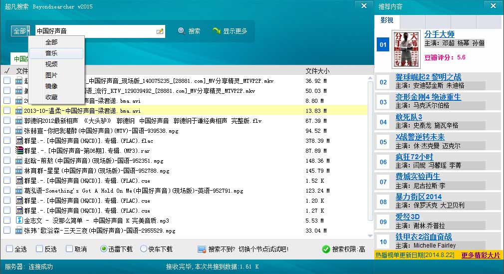 Beyondsearcher(超凡搜索器)是一款基于p2psearcher技术的BT资源搜索软件,基于先进的p2psearcher搜索技术,可在瞬间搜遍全球ED2k网络资源,简单便捷的搜索到ED2K网络上共享的海量影音娱乐,学习资料等资源。搜索出来的资源可以用电驴或者迅雷下载工具下载,非常方便。