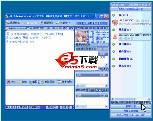 飞秋(FeiQ)是一款局域网聊天传送文件的绿色免费软件(目前不开源),它参考了飞鸽传书(IPMSG)和QQ, 完全兼容飞鸽传书(IPMSG)协议,具有局域网传送方便,速度快,操作简单的优点,同时具有QQ中的一些功能。飞秋(FeiQ)是一款局域网内即时通信软件,基于 TCP/IP(UDP)