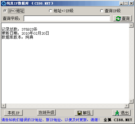 因为IP地址数据是民间收集的,而IP地址段会经常更改,所以有点遗漏、错误是难免的。可通过随数据库附送的软件(IP.EXE)对IP地址进行查询。假如发现IP地址有不对的,或想提供新的IP地址,请到纯真IP小秘书提供IP地址数据,或者登陆纯真时空论坛“电脑板块”中的“IP地址”版块告诉我们。或者加入纯真QQ门户,在QQ上就能直接上报错误的IP数据,以便及时更新IP数据库。