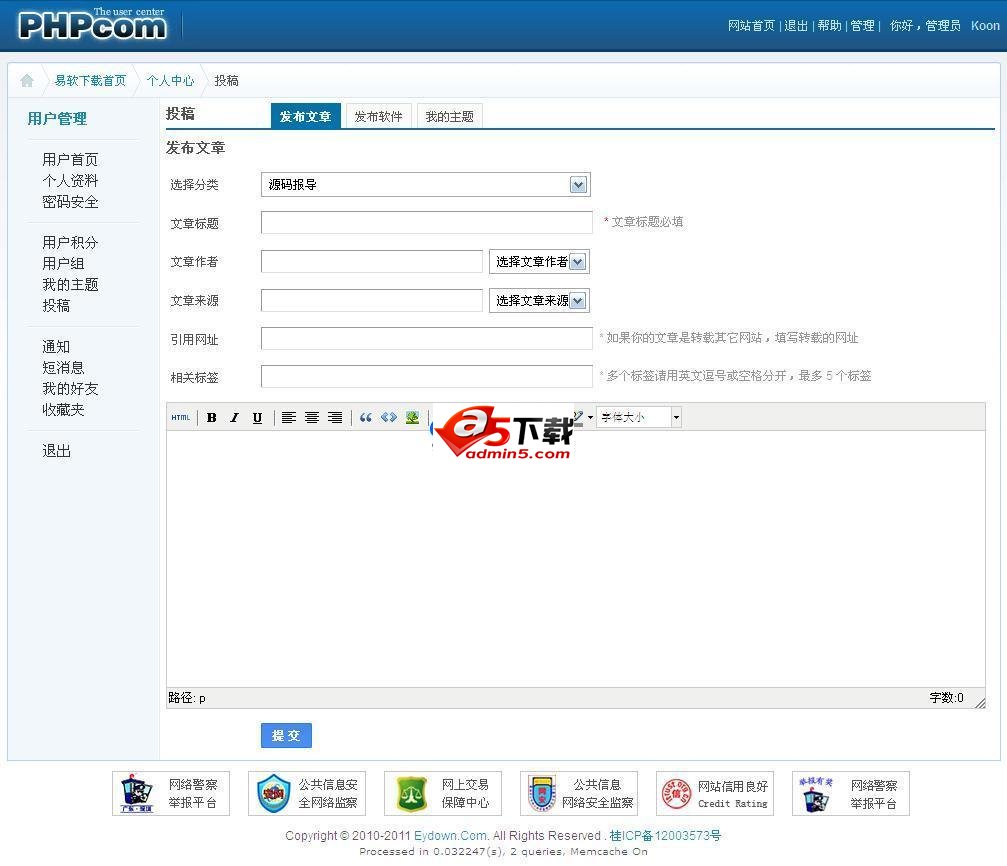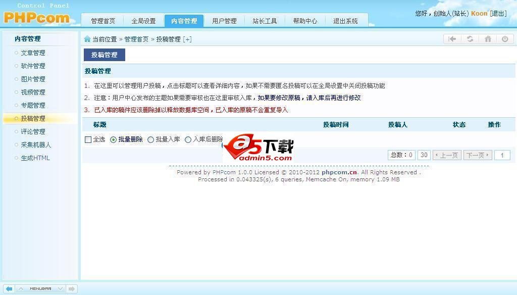PHPcom 内容管理系统 v1.5.0 UTF8更新日志