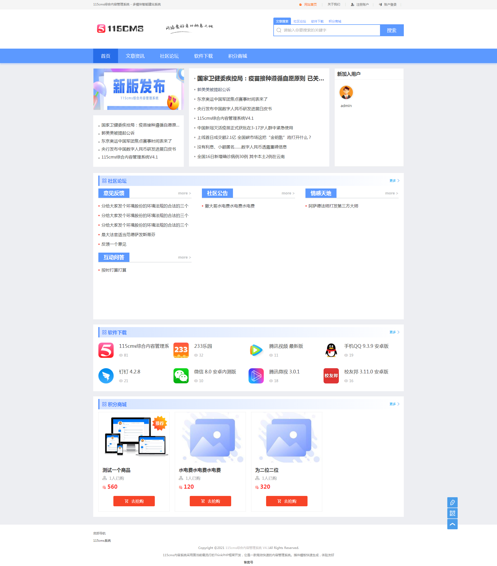 115cms综合内容管理系统是一款采用当前最流行的ThinkPHP框架开发的高效开源的内容管理系统。本产品完全采用模块化开发,插件主题功能,增加了程序的维护性、可扩展性,使二次开发变得简单、容易,系统设计的模板标签,让前端人员可独立完成模板制作及数据调用。