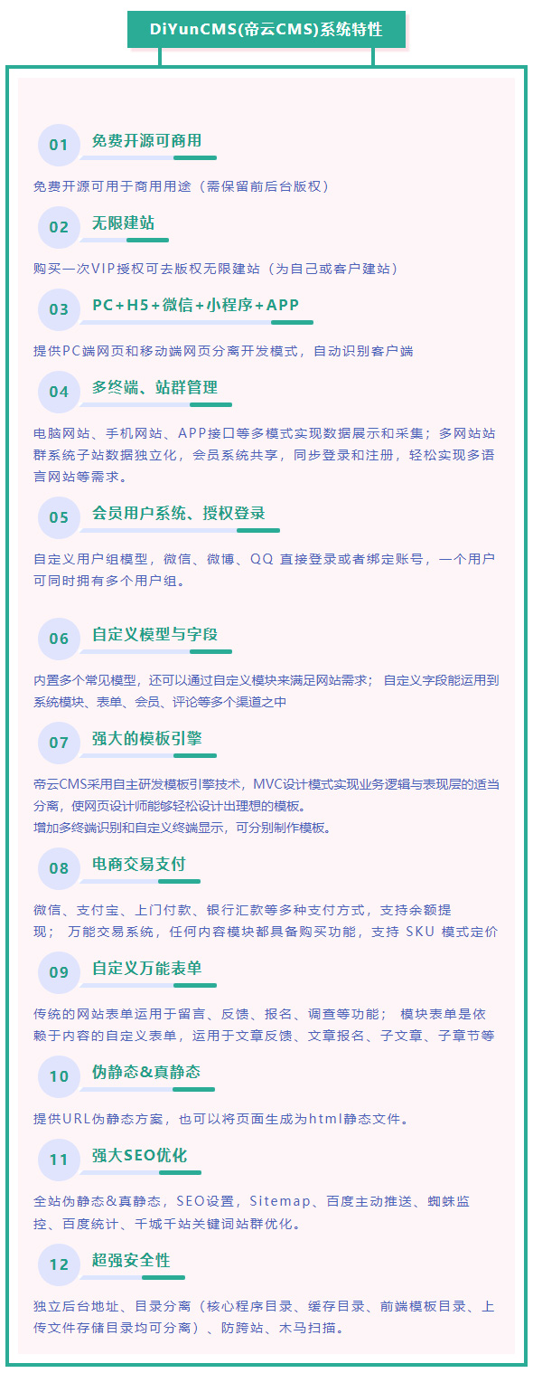帝云CMS内容管理系统是基于PHP7语言采用最新CodeIgniter4作为开发框架生产的网站内容管理框架,提供“电脑网站 + 手机网站 + APP 接口”一体化网站技术解决方案。她拥有强大稳定底层框架,以灵活扩展为主的开发理念,二次开发方便且不破坏程序内核,为 WEB 艺术家创造的 PHP 建站程序,堪称 PHP 万能建站框架。