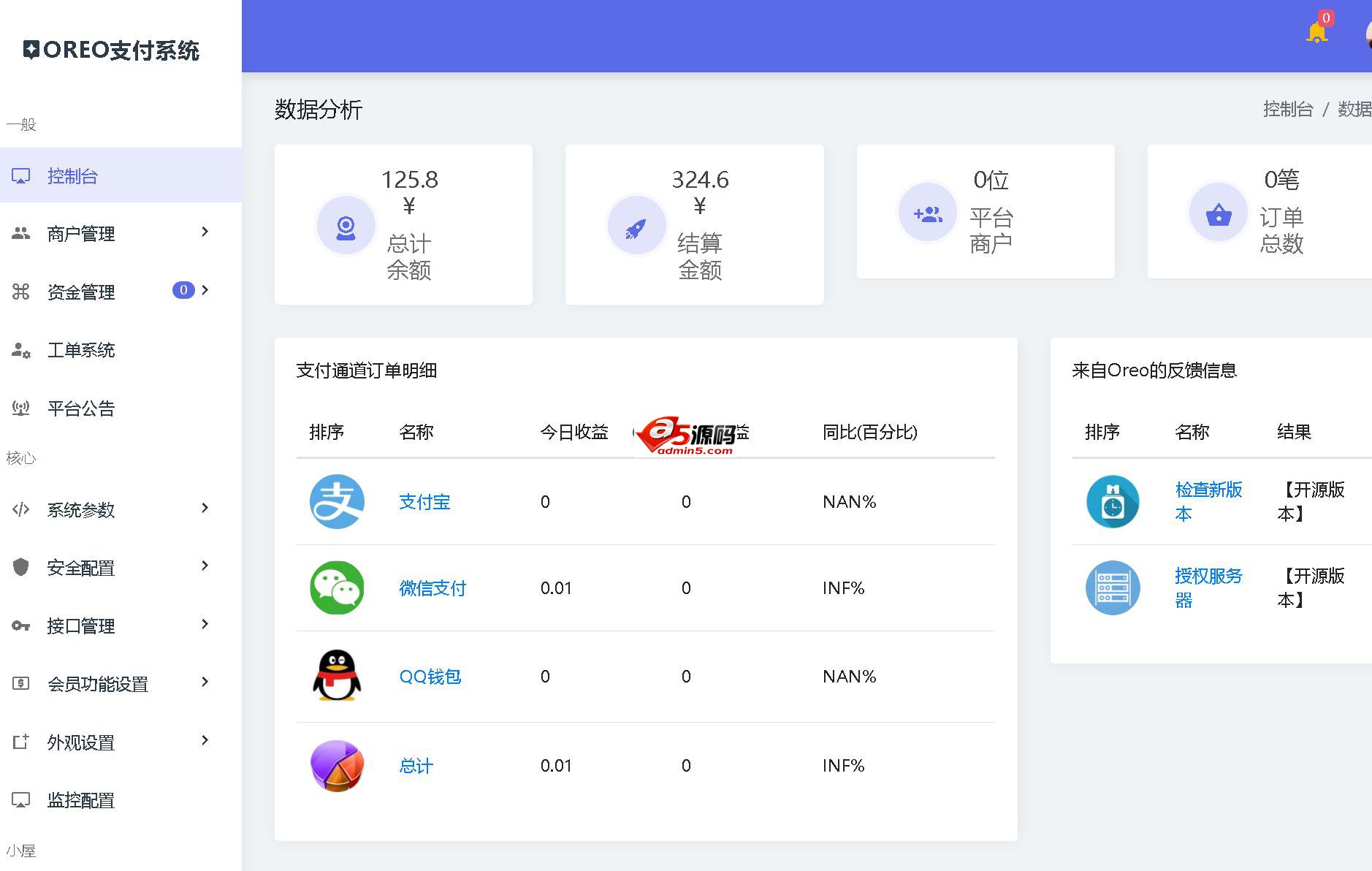Oreo易支付开源版更新简介: 1、支持批量生成商户 2、支持各种程序对接 3、支付查看订单信息 4、可以自定义网站信息 5、自带开发文档和对接官方和第三方支付的SDK 6、即时到账功能,别家的是没有的哦。 7、支持QQ、支付宝快捷登录功能。(默认开启) 8、自动提现功能。(本功能属于订单操作,需要人为转账后确认自动提现订单即可。) 9、附带9套前台模板,后台直接切换即可!