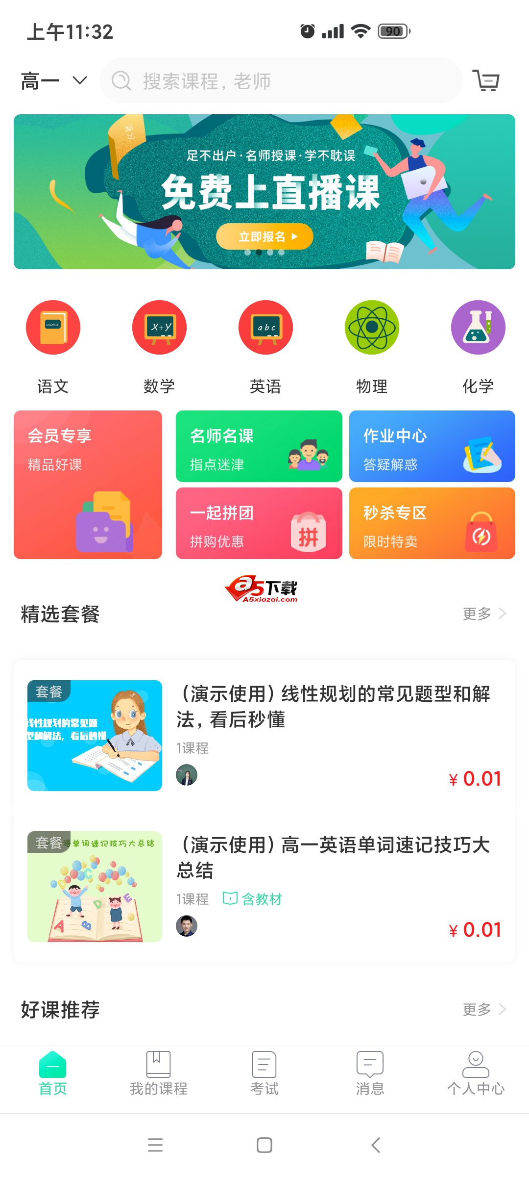精选套餐、好课推荐、精选内容、直播课堂,四大课程栏目,不同学习体验。