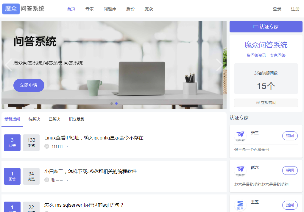 魔众问答系统是一套轻量级问答管理系统,支持多用户在线问答,在线专家等模式,帮助您快速搭建私有化的问答系统