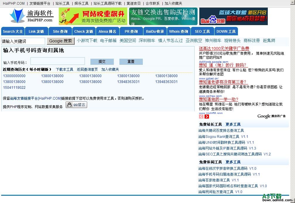 主要功能: 1、输入手机号码查询归属地,带查询历史记录方便搜索引擎抓取; 2、百度小偷工具,无需维护数据; 3、DIV+CSS模板方便修改; 4、免费、开源程序。