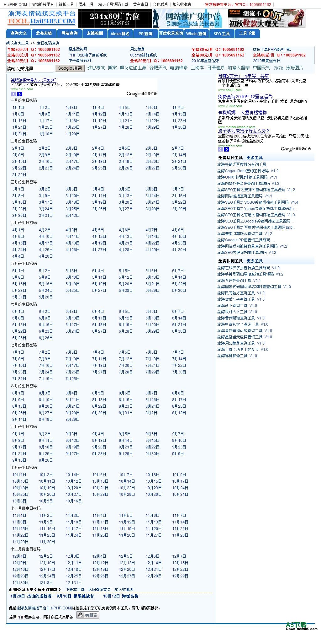 主要功能: 1、每一天出生的人都有自己的生日密码,决定您一生的性格、发展。本工具提供全年生日密码,内容丰富; 2、带查询历史记录方便搜索引擎抓取; 3、DIV+CSS模板方便修改; 4、免费、开源程序。