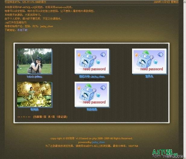 本相册采用PHP+MYSQL+JQ实现的;布局采用xhtml+css完成。 相册可以设定密码,相片也可以设定独立的密码,让不想别人看的相片得到保密。 本相册开放源码,大家共同学习。 由于个人初学,请大虾不要见笑,不足之处请指点。