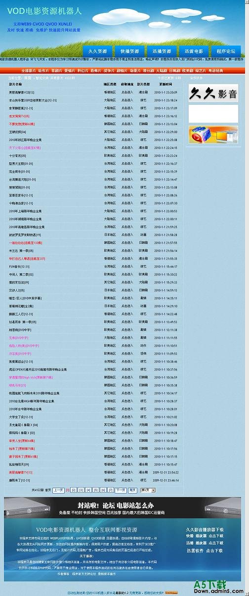 4.官方实时更新程序,自动选择 片源多 速度快 网页广告少的资源网站作为采集对象,保证程序长久有效。VOD机器人,帮你节省网站维护时间,缩短网站建设周期,为你的网站带来大批流量,让你的网站在2010年火爆起来!