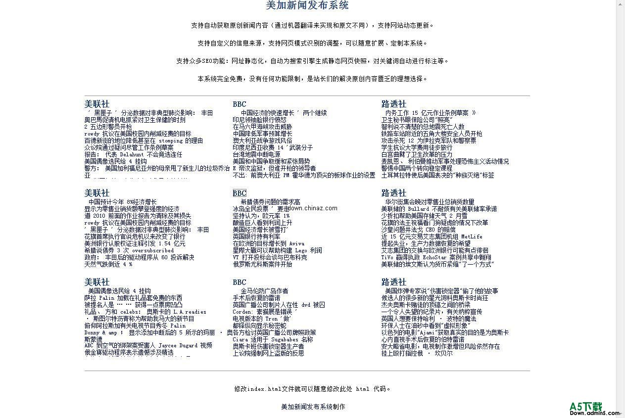 美加新闻发布系统——支持自动生成原创内容并实时发布,支持SEO。可以自由扩展信息源,定制网页,完全免费开源网站软件。