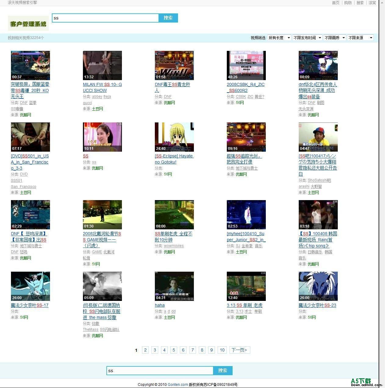 优酷旗下视频搜索——搜酷(soku.com)上线,可以选择搜索优酷站内的视频,也可以搜索全网的视频,也可以根据视频长短、发布时间、清晰度等信息搜索。 Gonten写了个soku.com的视频搜索小偷程序,文件不多,代码很少,但是搜索是OK的。文件压缩包共21KB,有兴趣的朋友可以下载来看看,对于想学习写小偷程序的朋友,这是个很不错的例子哦。