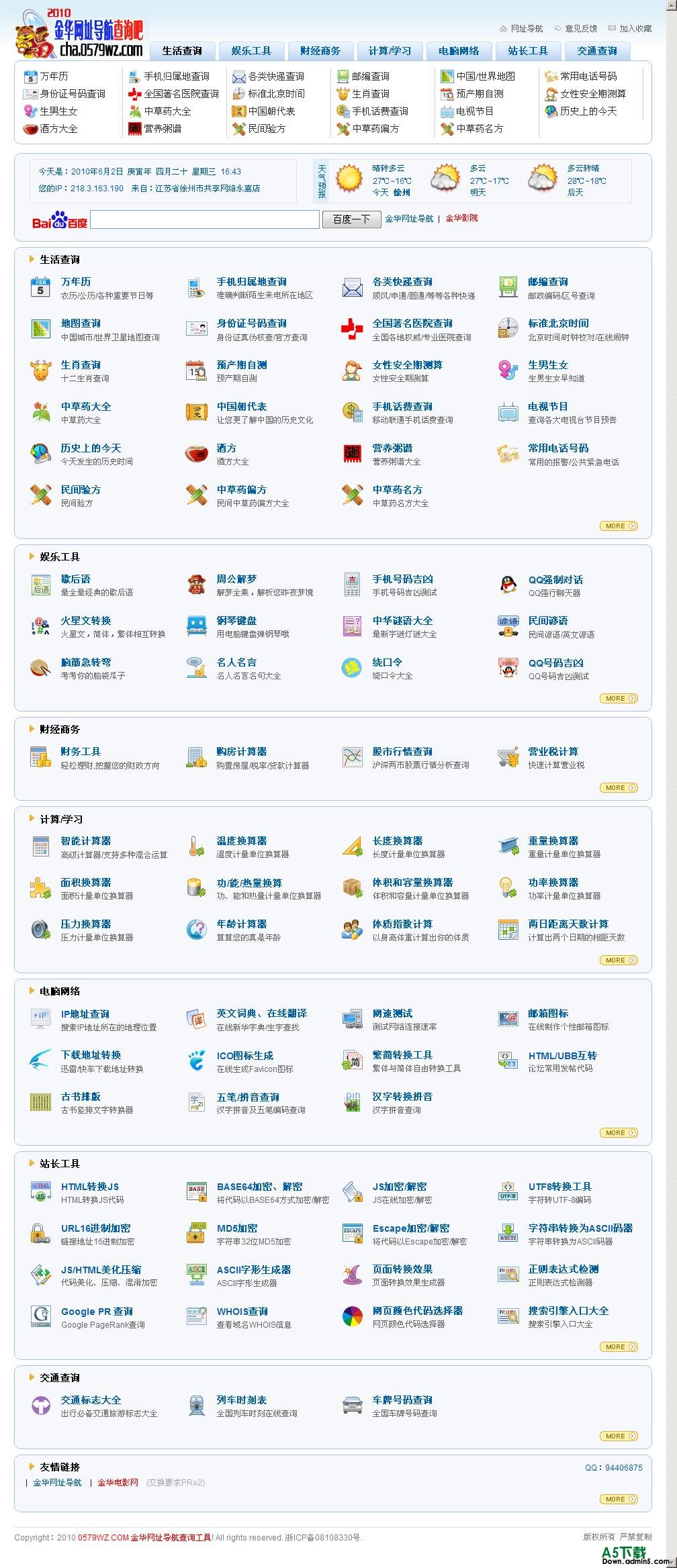 金华网址导航查询吧“查询吧”是集生活查询、娱乐工具、财经商务、计算/学习、电脑网络、站长工具、交通查询等各类查询工具。内含将近100个查询项目。界面漂亮,是每个站长必备查询工具。演示:http://cha.0579wz.com