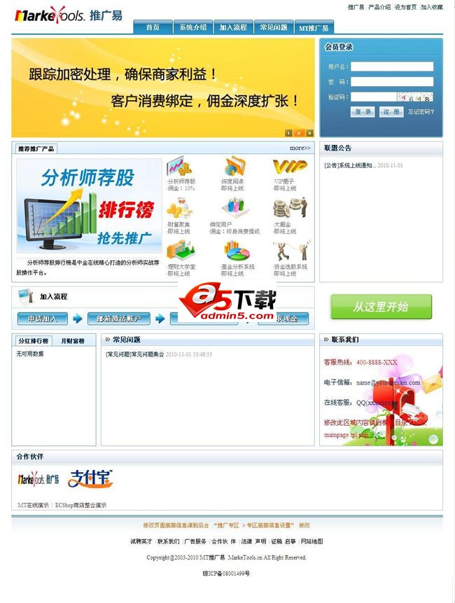MT 推广易是一套使用 PHP+MYSQL 编写的效果营销管理软件,安装在商业网站中 ,帮助网站主招募和管理 联盟会员 、 发布广告 、 跟踪推广业绩 、 为 联盟会员 分配佣金 , 管理网络营销团队 ! 使用 MT 推广易 可以吸引更多访问者并提升营销销售业绩 , 便宜且效果非常好 。