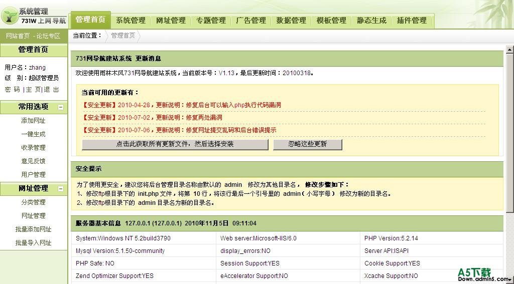 731网导航系统是采用PHP+MYSQL制作的功能全面的网址导航系统,它拥有功能完整的后台管理系统,可以不限分类级数,无限添加站点。可以自定义模板,一键生成全站HTML,便于搜索引擎收录。可自定义广告,使网站可以获得收益,使网站功能更加强大。