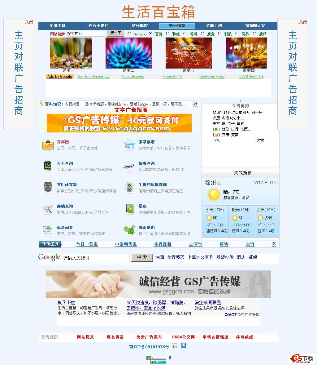 生活百宝箱-实用工具大全,包含万年历,数学计算器,聚合搜索,公交查询,城市地图,网址导航,火车查询,家常菜谱,长度换算器,航班查询,房产计算工具,身份证查询,星座运程,电视预告,天气预报,邮编区号,交通违章,在线翻译,IP域名地址查询等等。 主要是HTM页面,其中IP域名地址查询需要PHP支持。