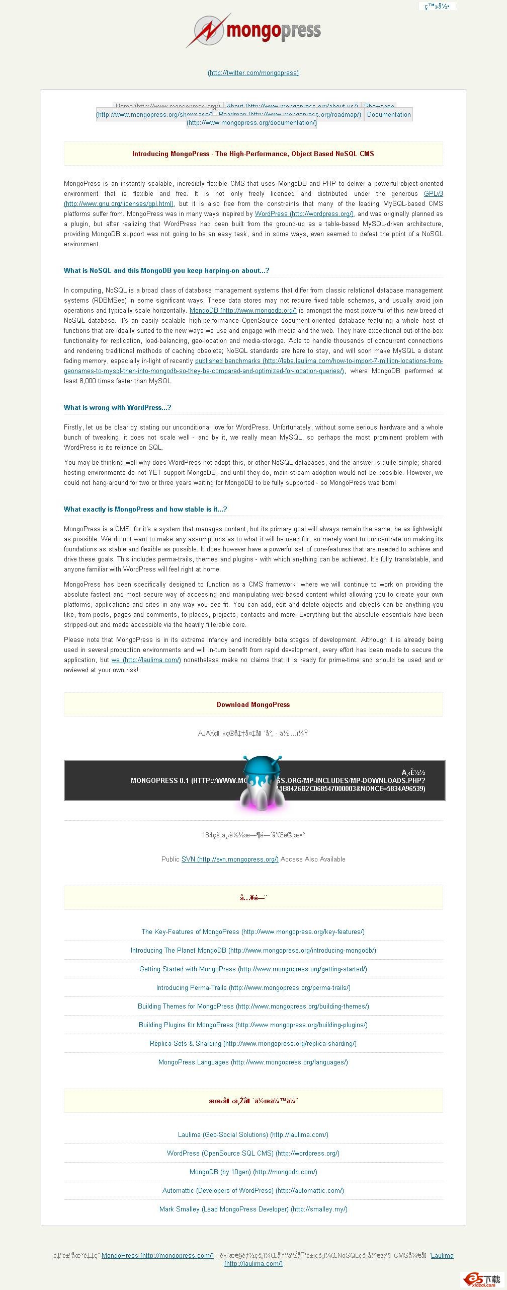 MongoPress原本是打算作为WordPress的插件存在,但是由于WordPress众多的特性和第三方插件都依赖于其最根本的MySQL存储,所以MongoPress才以一个全新的项目开始,其数据全部存在MongoDB的文档型存储中,而其文件则采用了MongoDB的GridFS来进行存储。