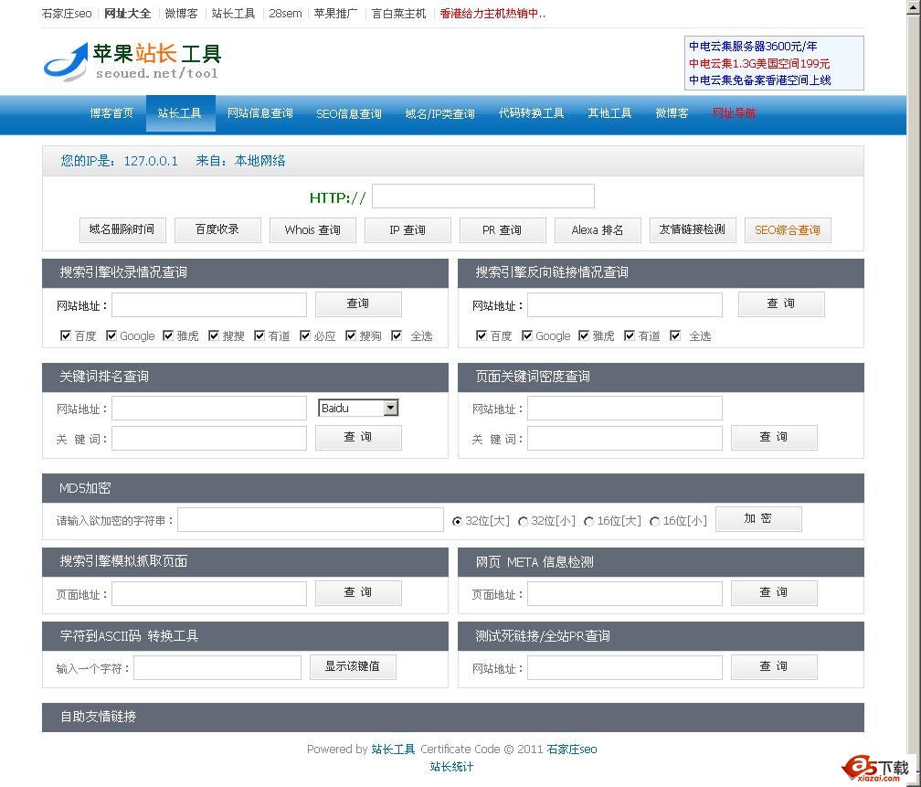 站长工具功能简介:1、JS加密/解密(将代码以js形式进行加密或解密。)2、UTF-8编码转换工具(UTF-8编码转换。)3、Unicode编码转换工具(Unicode编码转换。)4、友情链接(通过本工具可以批量查询指定网站的友情链接在百度的收录、百度快照、PR以及对方是否链接本站,可以识破骗链接。)5 、META信息检测(通过本工具可以快速检测网页的META标签,分析标题、关键词、描述等是否有利于搜索引擎收录。)6、MD5加密工具(对字符串进行MD5加密。)7 、身份证号码值查询(查询身份证所在地、性别及出生日期。)8、HTML/UBB代码转换工具(HTML/UBB代码转换。)9、HTML/JS互转工具(HTML/JS互转。)10 、搜索蜘蛛、机器人模拟工具(通过本工具可以快速模拟搜索引擎蜘蛛访问页面所抓取到的内容信息!)