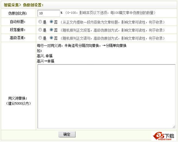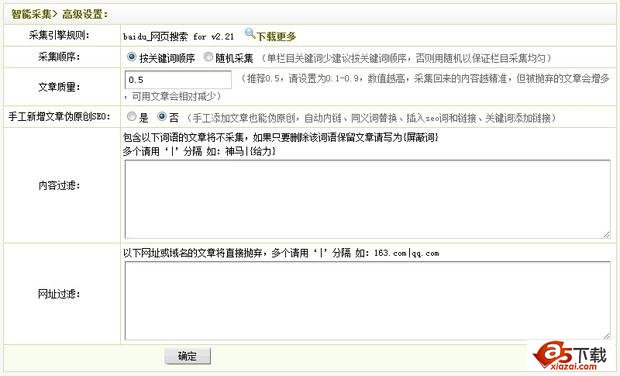 自动标题、段落重排、高级混淆、自动内链、内容过滤、网址过滤、同义词替换、插入seo词语、关键词添加链接等多种方法手段对采集回来的文章加工处理,增强采集文章原创性,利于搜索引擎优化,提高搜索引擎收录、网站权重及关键词排名。