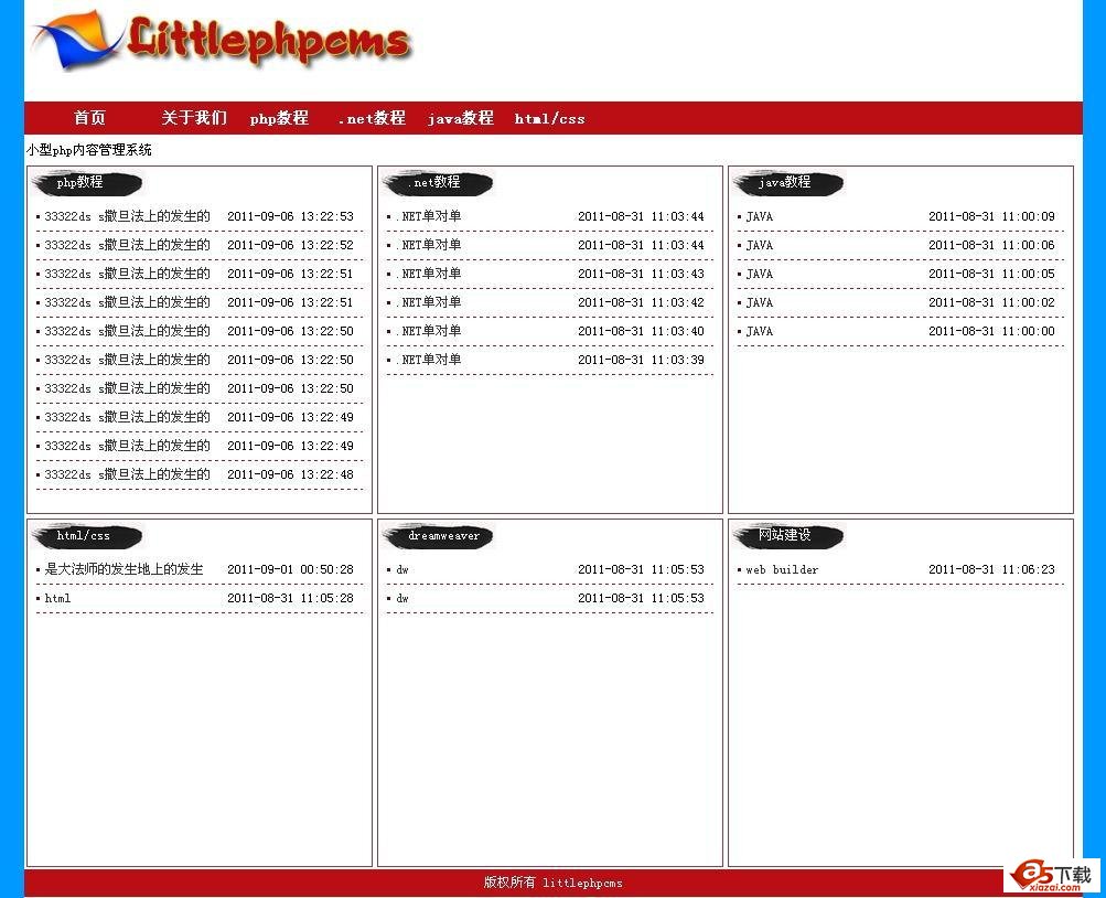 littlephpcms特色: 1.模板制作不用修改路径。 2.后台ajax操作。 3.标签简单易用,与界面完全解耦。 4.多模板支持,可以后台切换模板。 5.适合二次开发。