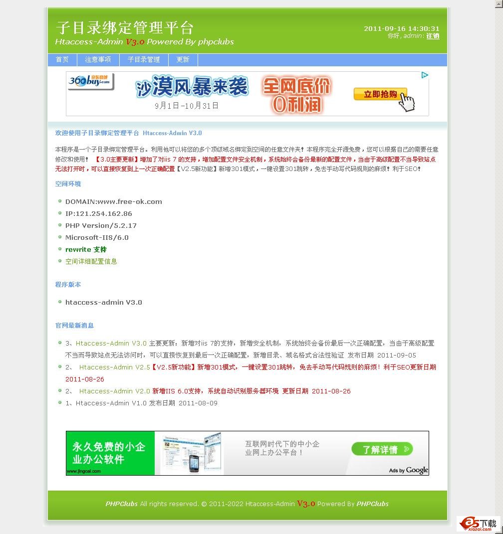1、该版本 为Htaccess-Admin V3.0 目前支持的Web服务器: Apache、IIS 6、IIS 7