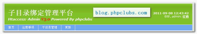 HtaccessAdmin子目录绑定管理平台是一个开源的PHP WEB 应用——子目录绑定管理平台。利用他可以将您的多个顶级域名绑定到空间的任意文件夹!本程序完全开源免费,您可以根据自己的需要任意修改和使用! 【3.0主要更新】增加了对iis 7 的支持,增加配置文件安全机制,系统始终会备份最新的配置文件,当由于高级配置不当导致站点无法打开时,可以直接恢复到上一次正确配置【V2.5新功能】新增301模式,一键设置301跳转,免去手动写代码规则的麻烦!利于SEO!