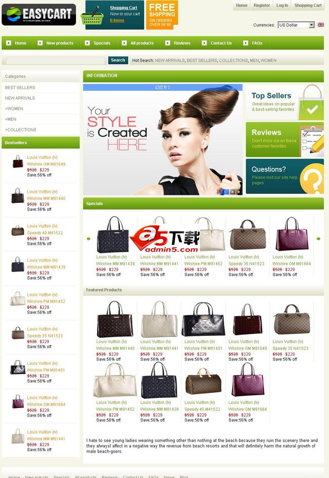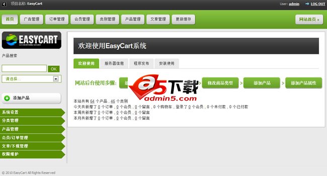 Easycart是一款专业的电子商务网站程序,为各大企业提供最适合的电子商务网络销售网站前后台方案。Easycart是Easycart开发团队通 过对现代电子商务以及消费者购物方式进行深入研究,充分了解企业以及消费者的需求后研发的现代电子商务行业使用的程序。面向不同的企业品牌、代理商提出了 不同的方案,用户可根据企业自身特点,调整后台设置,创建最适合自己的网店模版。易学、易用、易管理、易推广,高效实用,完美实现前后台交互式管理,是目 前最适合、最流行的现代电子商务网店程序之一。