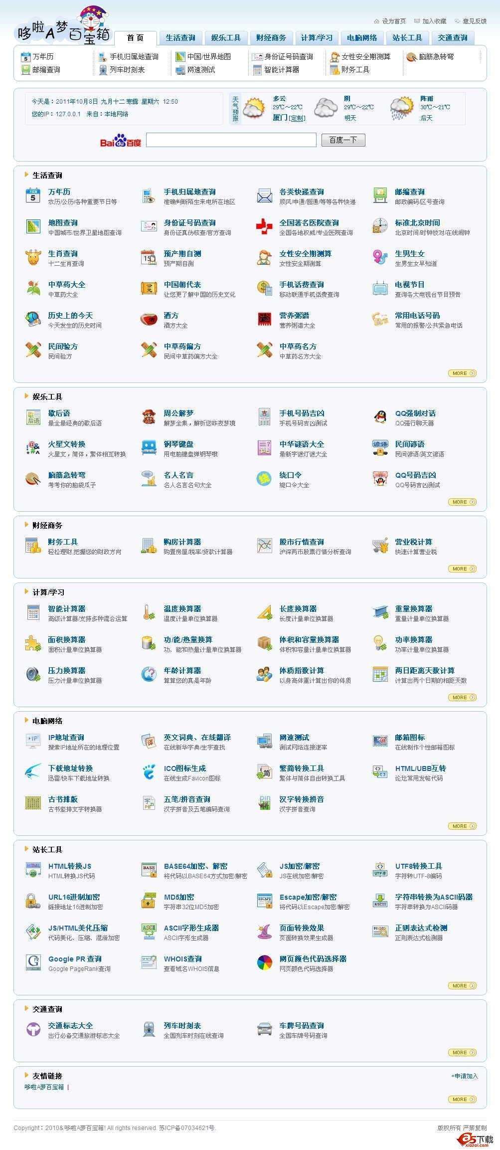 多啦A梦百宝箱,本人完美无错,主流浏览器完全兼容。现在提供整站下载。五六十种常用功能 做工具站必备。添加了五六种常用功能,如在线ps,wap浏览器等。