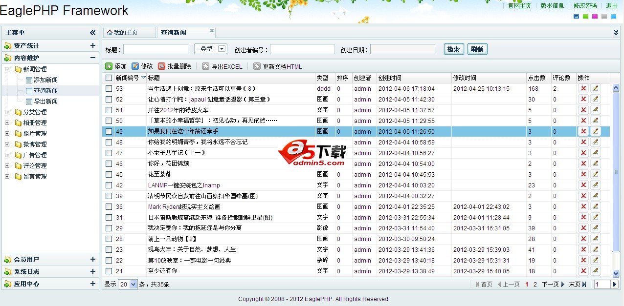 EaglePHP,是一款开源、高效、面向对象的PHP MVC开发框架,完全基于PHP5可用于开发WEB程序和服务,借鉴国外优秀框架的设计思路,分层的设计思想使独立开发成为可能,建立模型推动代码的重用,有助于促进快速软件开发(RAD)和创建更稳定的程序,节约了开发者的时间,并减少重复编写代码的劳动。