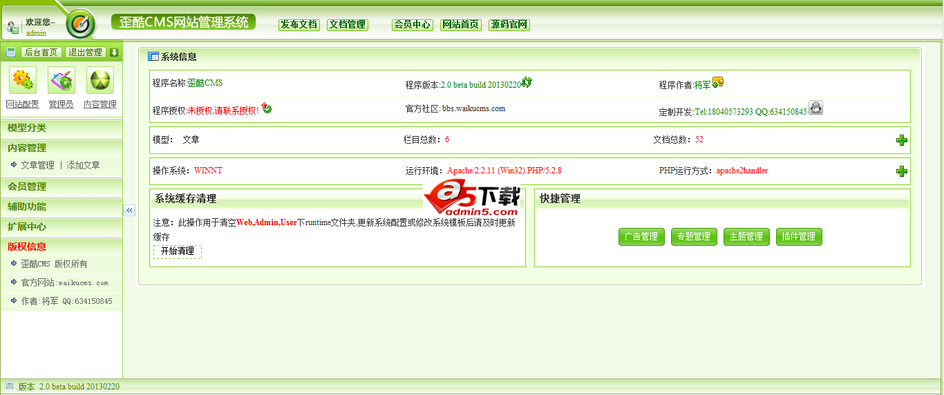 歪酷网站管理系统(歪酷CMS)是一款基于THINKPHP框架开发的PHP+MYSQL网站建站程序,本程序实现了文章和栏目的批量动态管理,支持栏目无限分类,实现多管理员管理,程序辅助功能也基本实现了常见的文章内关键字替换,文章内自动分页,手动分页,心情投票,留言和评论均采用了AJAX无刷新技术,数据库备份和还原,系统已经实现了伪静态,支持自定义伪静态后缀等等。
