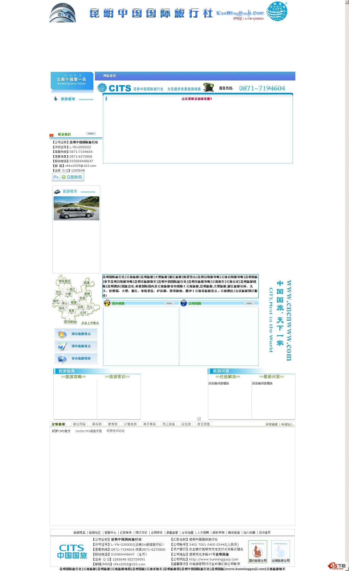 昆明中国国际旅行社基于织梦dedecms系统制作,简单大气。上传后正常安装织梦,再导入数据库生成即可。操作简单。全新的网站没有内容,没有版权。可在线采集,也可以安装织梦采集侠,只需加上您当地的旅游行程即可以做成一个当地大气的旅游网站了~有不明白的可以联系我本人安装哦~后台用户密码admin