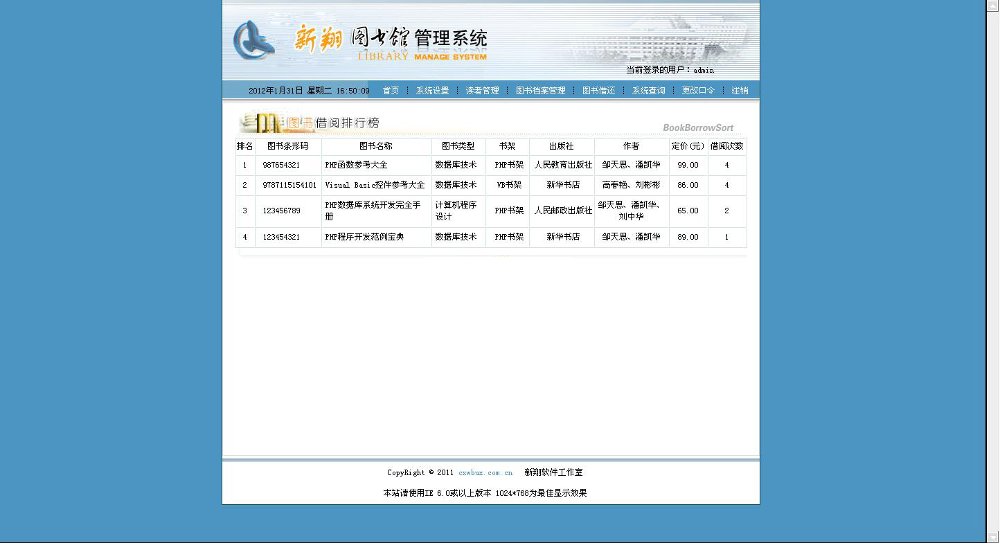 新翔图书馆管理系统是针对中小型图书馆的管理的要求进行设计的,实现了图示分类查询、借阅等强大的管理能力;可以按不同条件查询各个类别的图书、可以管理图书借阅、归还信息。可以管理用户信息,系统中管理员可以分配不同级别的权限。