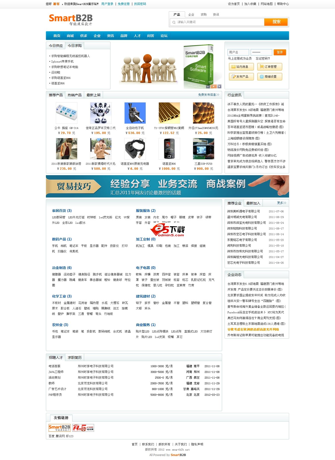 SmartB2B 是一款基于PHP、MySQL、Smarty的B2B行业电子商务网站管理系统,系统提供了供求模型、企业模型、产品模型、人才招聘模型、资讯模型等模块,适用于想在行业里取得领先地位的企业快速假设B2B网站,可以运行于Linux与Windows等多重服务器环境,安装方便,使用灵活。
