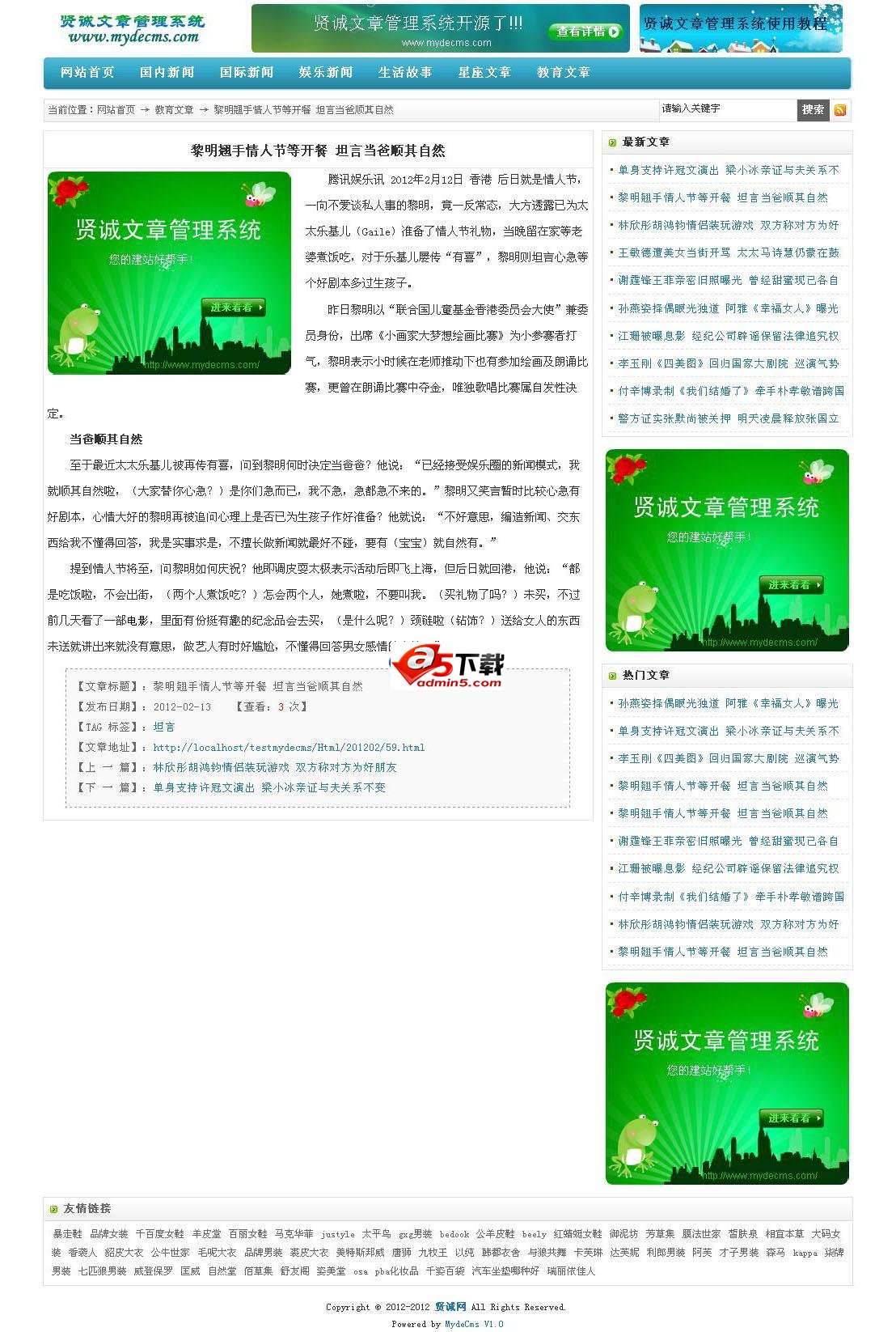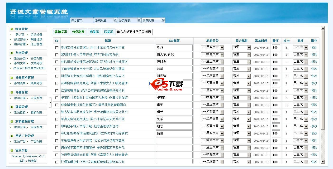 贤诚文章管理系统是一款采用PHP+Mysql开发的程序,前台采用DIV+CSS布局,PHP模板分离技术。主要功能有蜘蛛爬行统计器、无限分类、后台多框架小窗口操作。
