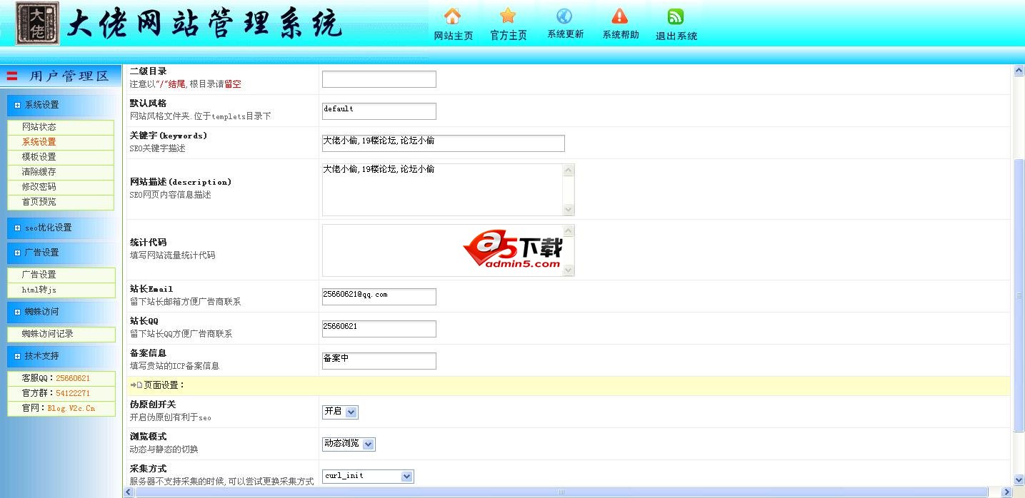 4.采用目前主流小偷系统的四种采集方式,兼容主流空间服务器,独立模板风格也可以自己设置。
