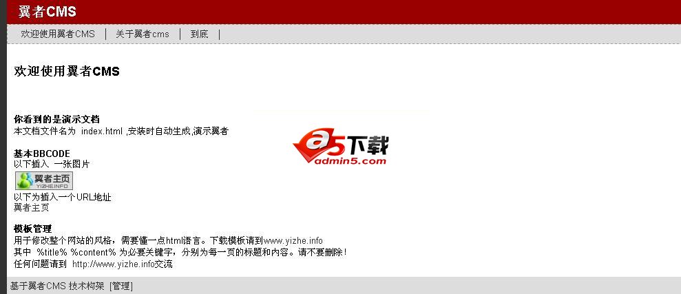 本系统由php语言驱动,但是不需要mysql数据库支持,所以可以给没有数据库的各位免费空间用户或者不会使用mysql的朋友使用。本系统前台全部为静态页面显示。所以只需要php环境空间,不需要mysql数据库就可以创立一个简单的个人主页了。并且系统非常小,非常适合喜欢简洁的朋友使用。并且适合免费空间使用。所以在测试空间的时候非常合适哦快速建站系统堪称史上最小的CMS系统,压缩包不足6K大小,适用于快速构架100个页面以内的树型结构网站。