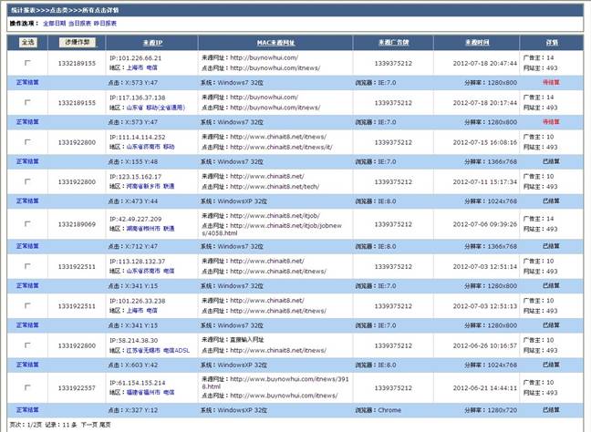 统计包括IP,来源网址,点击网址,点击坐标,浏览器,分辨率等。