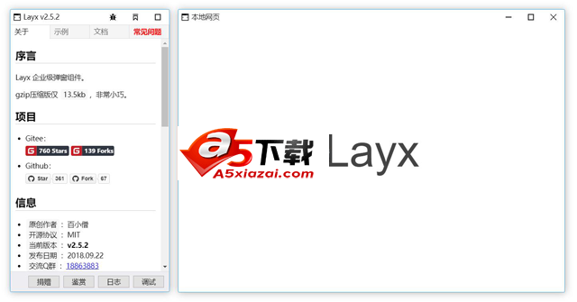 支持多种窗口类型:文本窗口,页面窗口,窗口组,提示窗口,消息窗口,询问窗口,输入窗口,加载窗口、浮动窗口、置顶窗口、倒计时窗口、只读窗口