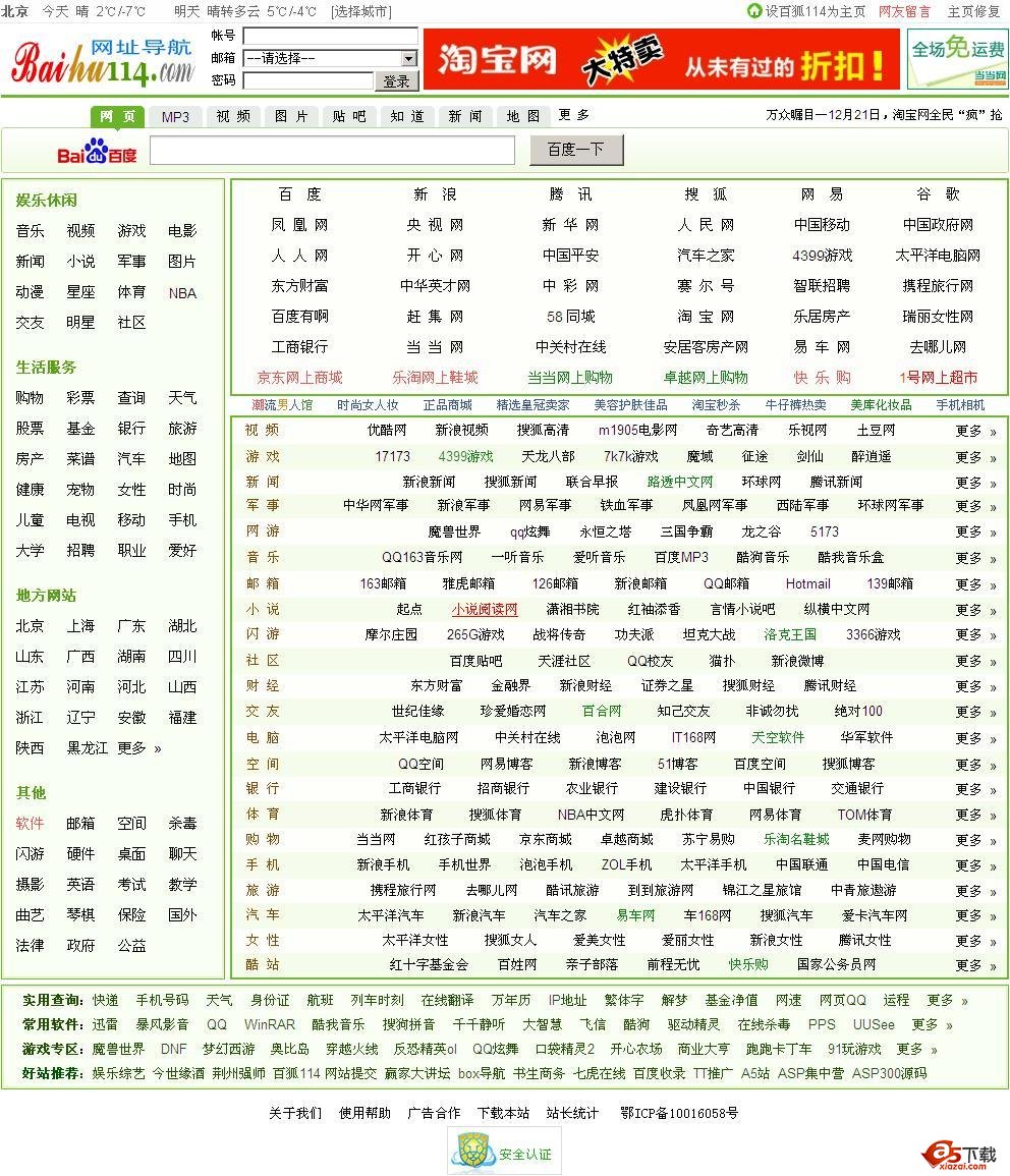 本程序由百狐114独立开发,是 目前网络最好的高仿hao123源码,2块模板,一款是hao123,另一款是百狐114的,站长可以根据需要选择。邮箱完整登陆,天气预报接入中国天气网,广告功能强大,只需要修改首页网址直接上传到空间即可,访问速度超快,是导航网站建站首选的源码。