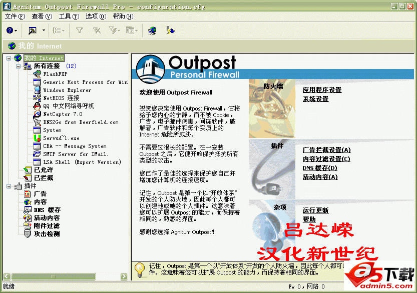 来自俄罗斯的网络安全解决方案!它为您在网络冲浪时提供了全面的安全防护。具有一般防火墙常有的应用程序访问规则控制以及独特的私人信息保护 (防止密码泄露)、内容管理 (防止您的孩子或员工查看不合适的网页内容,允许按特定关键字以及特定网地进行过滤)、DNS 缓存保护、Web 页交互元素控制 (过滤您不需要的例如 GIF/ActvieX/Flash/图片等界面元素)、反间谍软件 (带有类似杀毒软件实时监控,防止恶意软件的入侵)、特定应用程序行为控制等~独特的自我保护机制可以防止 Outpost 自身被恶意软件非法终止或运行所需的文件被篡改。Outpost 在 PC Professionell 杂志举办的测试中获得了 88.5 的高分~并在 CHIP! 杂志的防火墙功能性评选中胜过了 Zone Alarm 和 Tiny! 请选择 Outpost Firewall Pro 作为您的网络守护神!