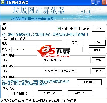垃圾网站屏蔽器结合扩展界面支持库,通过修改hosts文件实现屏蔽垃圾网站。 使用说明: 打开软件后,可以查询网站是否为垃圾网站,可以增加、删除地址,提交网站鉴定后点击屏蔽,注:屏蔽需要一定时间,请等待软件提示屏蔽成功后关闭软件,中间不要对软件做任何操作。 点评: 垃圾网站屏蔽器利用了系统hosts文件可以设置禁止访问的网站的特性来完成的,实现了屏蔽垃圾网站的功能。