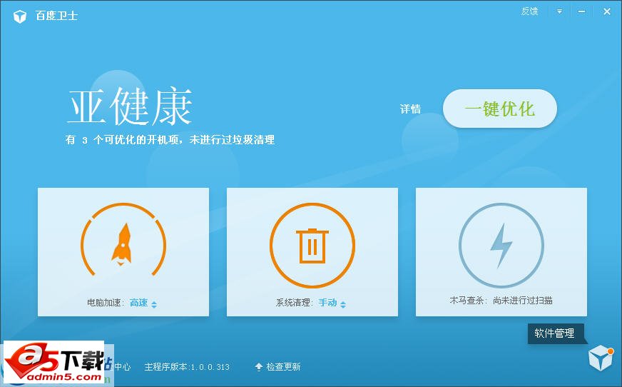 电脑健康状态与四大系统服务!百度卫士采用实时更新健康状态的方式,开启后可以立即显示电脑健康状态。如果您的电脑状况不理想,百度卫士会显示您的电脑状态为“亚健康”,并告知您需要被优化的项目。点击“一键优化”,便可快速优化所有项目,使您的电脑达到健康状态!您还可以通过电脑加速、系统清理、木马查杀和软件管理四大服务精确地优化电脑各项问题。