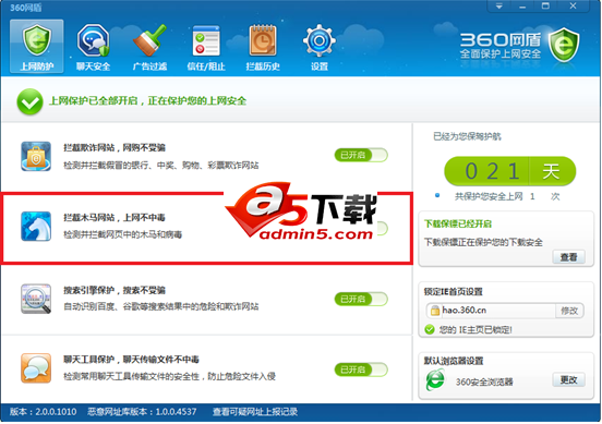 360网盾占用资源小,不影响用户正常浏览网页,还拥有“主页保护”、“浏览器一键修复”、“搜索引擎保护”、“下载文件保护”和“默认浏览器保护”等贴心的功能,全面地为您的上网冲浪保驾护航。