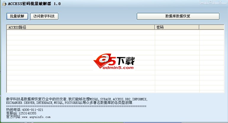 当您忘记自己的ACCESS数据库密码时,可用此工具查看,支持ACCESS97/2000/XP/2003,可查看20位的ACCESS2000密码,并且支持中文密码可以批量解密多个MDB数据库